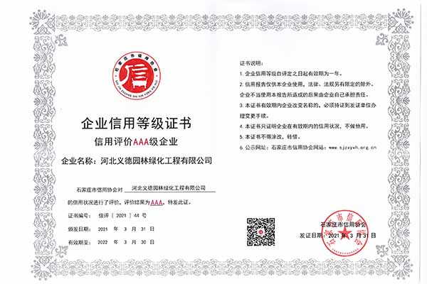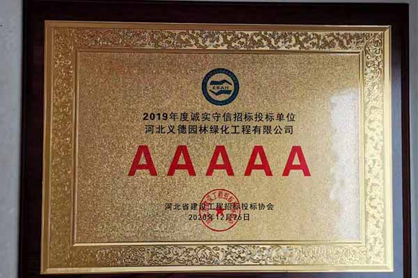 近幾年來我公司被授予2019年-2022年河北省扶貧龍頭企業(yè)、2018年國家林業(yè)標準化示范企業(yè)、2019年度全國苗圃50強、2018-2019年度河北省林業(yè)重點龍頭企業(yè)、2018年保定市精品特色現代農業(yè)園區(qū)、2018年度保定林木種苗協會授予特色苗圃、2018年度北方十佳特色苗圃、2016-2019年河北省建設工程招標投標誠實守信5A級施工企業(yè)等榮譽稱號,2017年保定市林木種苗龍頭企業(yè)、石家莊市2017年度優(yōu)秀園林企業(yè)。